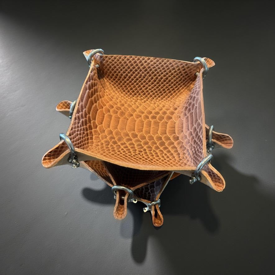 Our valet trays serve as a beautiful catch-all for your front door, desk, or nightstand. Made from full-grain leather in blue, black, and brown, each tray features a hand-embossed anchor design with a stitched center square for storing trinkets and jewelry. The pictures showcase our various embossed anchor designs, and we also offer an elegant snake-embossed option. Each tray is accented with stainless steel shackles at the four corners, adding a unique aesthetic. These valet trays make amazing gifts for the holidays, as well as for dads, grads, and birthdays.