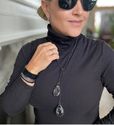 Our Zoe lariat necklace is a head turner! Made of soldered gunmetal plated brass and crystal cut glass, you’re going to love how they catch the light!